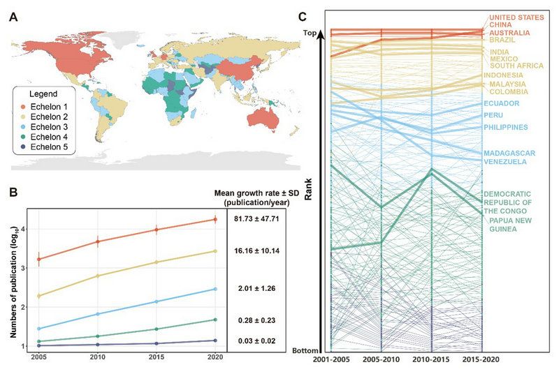 中大新闻网讯(通讯员范朋飞)在全球生物多样性加速丧失的背景下,各国的研究者和管理者们采取了多样的手段和措施来应对生物多样性危机,但不同国家和地区在保护能力、投入和成效方面存在极大的差异。为实现2030年可持续发展目标和2050年生物多样性愿景,在COP15上发布的《昆明-蒙特利尔框架》承诺采取多样的行动来逆转生物多样性下降的趋势,其中包括提高各国的保护能力,尤其是发展中国家的保护能力。保护能力是指用以实现生物多样性保护目标的多种技能、知识和信息的集合体,而保护研究能力是其中最重要的组成部分之一。科学研究可以为保护行动提供基础的信息、提高公众的认识、改进保护区的管理,吸引保护资金等等。目前,尚未有研究在全球尺度上评估不同国家的保护研究能力,及其对生物多样性的保护成效。