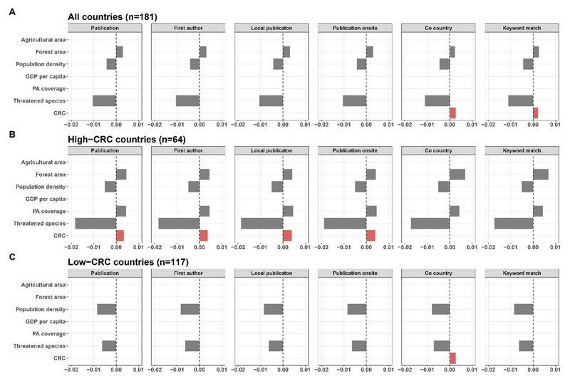 研究结果表明,1)国家间的保护研究能力差异巨大,大量生物多样性十分丰富的发展中国家保护研究能力薄弱;2)尽管大多数国家的研究能力在过去20年间均有所增长,但研究能力越高的国家增长越快,国家间的差距会进一步扩大(图2);3)研究能力指数与自然指数和IUCN专家组的主席数均存在较好的线性关系,说明指数对于国家间研究能力的差异有较好的体现;4)国家的研究能力对其国内的生物多样性保护具有积极影响,但在不同发展阶段的国家,作用机制存在明显差异:对于能力较强的国家,多数研究能力指数具有积极影响;对于能力较弱的国家,仅合作国家数有积极影响(图3)。基于上述研究结果,作者建议各国均需加强保护研究能力建设,研究能力较高的国家需增加保护研究的数量,而研究能力较低的国家需加强与其他国家的合作研究,并且要尽量避免“降落伞”式合作,以促进研究能力较低国家保护研究能力的发展。