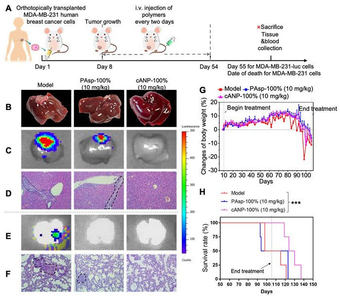 图4. cANP-100%的治疗有效减少MDA-MB-231人乳腺癌原位模型中癌细胞的肝转移和肺转移。(A)MDA-MB-231原位乳腺癌模型的实验流程图;(B)cANP-100%的治疗有效减少肝肿瘤结节数;(C)luminescence图显示cANP-100%有效抑制MDA-MB-231-luc肿瘤细胞向肝脏的迁移;(D)HE组织切片显示cANP-100%治疗后肝脏没有明显的肿瘤细胞浸润;(E)luminescence图显示阳离子聚天冬氨酸材料都有效抑制MDA-MB-231-luc肿瘤细胞向肺部的迁移;(F)HE组织切片显示cANP-100%组肺部没有明显的肿瘤细胞浸润;(G)治疗过程中小鼠的体重变化(H)cANP-100%的治疗有效延长肿瘤小鼠的生存期。