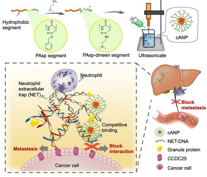 图1. cANP的制备和通过结合NET-DNA抑制NET诱导的肿瘤转移的示意图