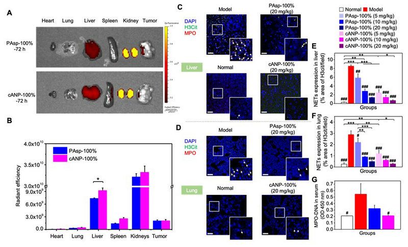 图3. 在肝脏有更好积累的cANP能更好地减少小鼠原位乳腺癌模型局部NET的浸润以及血清中NET-DNA的含量。(A-B)72小时PAsp-100%与cANP-100%在体内的分布情况;(C-F)不同组别中NET在乳腺癌模型肝脏(C, E)和肺部(D,F)的浸润情况;(G) 血清中MPO-DNA的浓度。