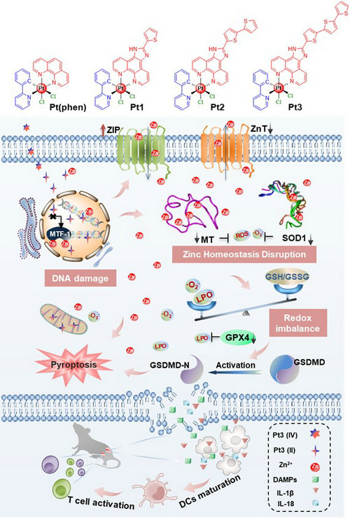 图1. 三噻吩修饰的新型铂(IV)配合物的设计及其在诱导DNA损伤的同时破坏锌稳态、进而诱导细胞焦亡并激活抗肿瘤免疫响应的机制示意图。