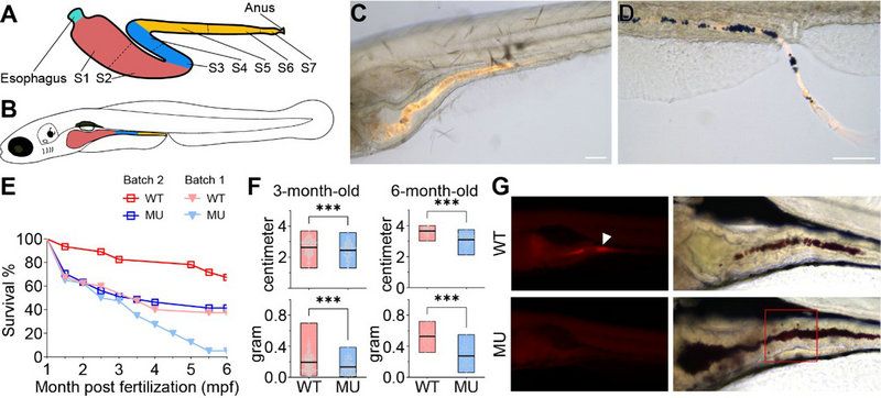 图1:斑马鱼肠道几丁质形态以及敲除前后的表型变化(A:斑马鱼成鱼肠道分段示意图;B:斑马鱼幼鱼肠道分段示意图;C,D:斑马鱼幼鱼肠道几丁质膜染色图,橘色为几丁质膜;E:一到六月龄斑马鱼生存率比较;F:三和六月龄斑马鱼体长体重比较,WT=野生型,MU=突变型;G:敲除前后幼鱼肠道几丁质膜以及消化过程对比,白色箭头指向几丁质膜,红色方框框出陷入肠绒毛间的微珠)。