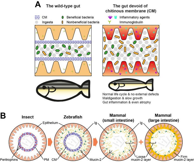 图3:斑马鱼缺失几丁质膜后的表型变化示意图和动物肠道径向结构的演化模型(A:几丁质膜缺失前后肠道以及外观变化;B:肠道径向结构在多个物种中的变化,PM=围食膜,CM=几丁质膜)。