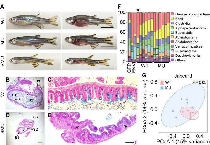 图2:斑马鱼肠道萎缩的图以及肠道微生物变化(A:六月龄不同斑马鱼对比,WT=健康野生型,MU=健康突变型,SMU=生病突变型;B – E:成鱼肠道切片阿尔新蓝染色图,C为B的局部放大,E为D的局部放大;F:斑马鱼肠道微生物物种柱状图,QFP=滤纸对照,ENV=环境水样对照;G:斑马鱼肠道微生物主坐标分析图)。