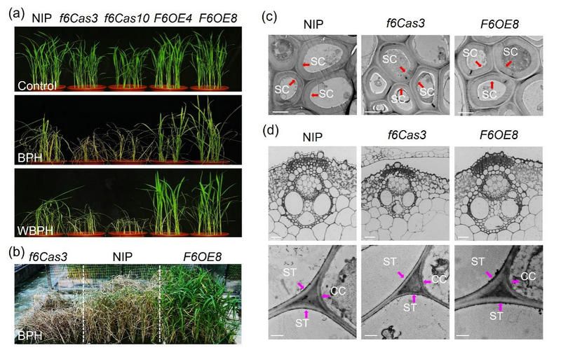 best365中国官方网站生命科学学院植物逆境生物学方向肖仕教授课题组利用分子遗传和代谢组学技术,筛选到禾本科植物特异性代谢物β-1,3;1,4-D-葡聚糖(Mixed-linkage β-1,3;1,4-D-glucan,MLG)是水稻JA介导稻飞虱响应的下游代谢物。JA信号转录因子OsMYC2通过直接激活OsCsLF6基因的表达,促进MLG积累,进而提升水稻对稻飞虱的抗性。过表达MLG合成酶关键基因OsCslF6能促进维管束组织的细胞壁增厚,从而显著增强水稻对褐飞虱和白背飞虱的广谱抗性;而OsCslF6的CRISPR-Cas9敲除株系则降低维管束组织的细胞壁厚度,对稻飞虱也异常敏感(图1)。