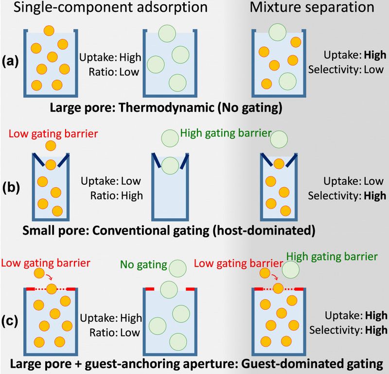 客体主导的门控吸附行为可以解释很多不合常理的吸附分离行为,也为解决吸附量和选择性之间的矛盾提供了一个解决方案。