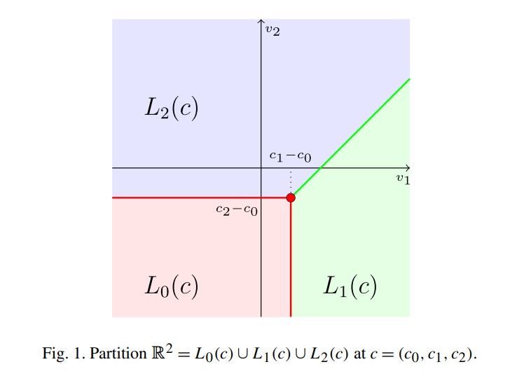 图1:当可选品数量为n=2,现状(选项0)和选项1,2的成本向量为c =(c0, c1, c2)时,具有拟线性效用并对选项0价值衡量为0的决策者可以被划分为二维欧氏空间里的三个区间:L0(c), L1(c), 和L3(c);这三个区间内拟线性决策者的效用最大化选项分别为0,1,2.