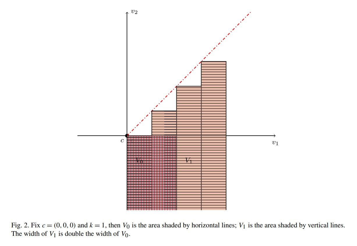 图2:在RQUM模型中,我们首先通过联合单一性公理(Joint Monotonicity)证明L0(c) 区域概率与观察到的选项0被选择的概率r0(c)相等,并用累计概率分布构造拟线性决策者的效用分布。然后,我们通过交叉价格中性公理(Cross Price Neutrality, CPN)以及一些连续性公理证明上述构造符合观测到的对其他选项的选择概率。上图表示用CPN构造L1(c). V_k(c)是由r0(c)所构造。当V_k中的k趋于无穷,V_k趋于L1(c).