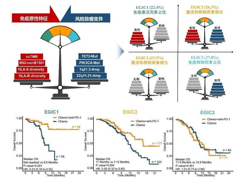 EGIC分型的构建(上)以及不同EGIC分型的患者在PD-1抗体联合化疗中的治疗获益(下)