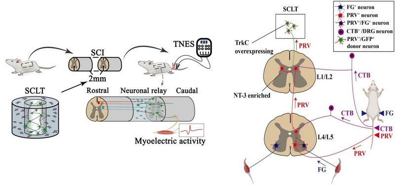 图1: 将类脊髓组织(SCLT)移植入大鼠全横断脊髓损伤处后实施尾神经电刺激(TNES),随后通过逆行假狂犬病毒(PRV)和荧光金(FG)示踪以及跨背根节(DRG)霍乱毒素亚型B(CTB)示踪脊髓神经环路解析协同效应性电刺激的作用机制(蓝色三角形示意注射部位)。