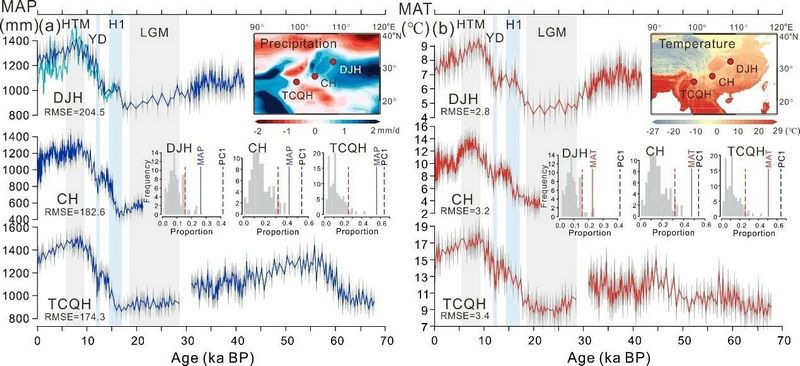 best365中国官方网站地球科学与工程学院的张潇、郑卓、黄康有等与国内外多家科研机构合作,利用最近更新的东亚表土孢粉数据库(EAPD)及亚洲季风区内3个年代尺度达到末次冰期的高分辨率孢粉记录(云南腾冲TCQH、贵州草海CH和湖北大九湖DJH),定量重建了距今6.8万年以来的气候(温度、降水)变化。结果表明: