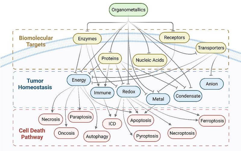 对于肿瘤细胞中过表达的生物因子(如受体、转运载体、酶、蛋白和核酸等),金属有机化合物可以通过金属中心配位、特定官能团引入和金属与配体间的协同作用实现对肿瘤相关生物分子的特异性靶向。一旦这些生物靶点功能受到影响,与之相关的下游通路会遭到破坏,相应的肿瘤稳态将会失衡。这些稳态主要包括能量稳态、氧化还原稳态、金属稳态、免疫稳态和聚集稳态等。最终,当这些稳态中的一个或多个无法维持正常平衡,肿瘤细胞将会以凋亡、副凋亡、自噬、胀亡、坏死、坏死性凋亡、铁死亡、焦亡和免疫原性死亡(ICD)等形式走向死亡(图2)。针对以上三个方面,本课题组系统总结了1)代表性生物靶向分子和相应金属中心及靶向官能团;2)与肿瘤稳态密切相关的生物过程、关键调节因子和通路;以及3)目前所报道的金属有机化合物能够引发的九种死亡方式的形态学和化学生物学特征,为抗肿瘤机制的研究和高效金属药物的合理设计提供了重要科学参考。