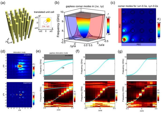 为解决这一难题,董建文教授团队通过在更高维度的空间中重新审视已有工作,研究发现:过去人们习惯于在动量空间中去实现和讨论拓扑光子晶体,但是动量空间的维度一般与实空间的维度保持一致,这极大地阻碍了人们对高纬度空间的拓扑模式的探索。受到合成维度物理和四维量子霍尔效应的启发,董建文教授团队通过引入两个额外的合成平移维度,并结合二个动量维度构建了四维空间的第二陈晶体(如图1(a)所示)。不同于二维空间中的第一陈数,表征四维空间中晶体拓扑属性的拓扑不变量是第二陈数。通过严格公式推导和详细数值计算,他们发现该四维合成空间中每条独立能带的第二陈数恒等于1,证实了这种第二陈晶体的内禀非平庸拓扑属性。进一步地,当对四维合成平移空间中的第二陈晶体进行维度截断时可以获得局域在相应低维边界处拓扑模式。特别地,当同时在两个周期方向上用PEC边界去进行维度截断时,可以观察到:局域在角落处的无带隙拓扑角模(如图1(b)(c)所示)。值得注意的是,这种无带隙拓扑角模的存在不依赖于晶体对称,因此提供了在任意晶体结构中实现光场局域的设计方案。同时角模频率覆盖整个光子禁带频率范围,这对于灵活地设计拓扑光子器件同样重要,可选择性设计微腔的响应频率。此外,位错是一种常见的实空间晶体缺陷,同样可以实现光场局域,支持局域模场。研究团队通过维度压缩将四维空间投影到一维空间,揭示了频率覆盖整个禁带的一维拓扑位错模。具体地,先固定每个原胞内圆柱的横向平移量Δx,然后建立纵向平移量Δy与方位角θ的线性关系后,可以得到由伯格斯矢量标定的位错结构,能够在不依靠PEC边界的情况下实现光场局域(如图1(d)所示)。进一步,这种拓扑位错模遍历所有Δx参数后可以重建出一维涡旋线模式(如图1(e)所示)。需要特别指出,这种拓扑位错模式在引入额外的缺陷后仍然存在,证明了其对各类扰动持有鲁棒性(如图1(f)(g)所示)。