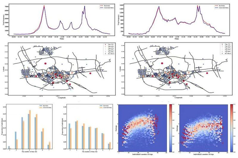 大量对比实验表明,生成数据集在宏观出行信息方面与真实数据高度一致,精确还原了城市的出行时间分布、出行高发的热点区域等。除此之外,生成的个体级出行数据中标注了出行个体的身份类型,刻画了不同类型出行群体在出行分布上的差异。个体维度方面,生成个体符合真实的出行逻辑,如具备出行的空间连续性;出行频次、出行间间隔、出行熵等信息均处在合理区间且与真实个体接近,即生成个体可被视为该城市中的“真实”个体,因此生成的个体出行数据集与真实数据集具有相近的研究价值。