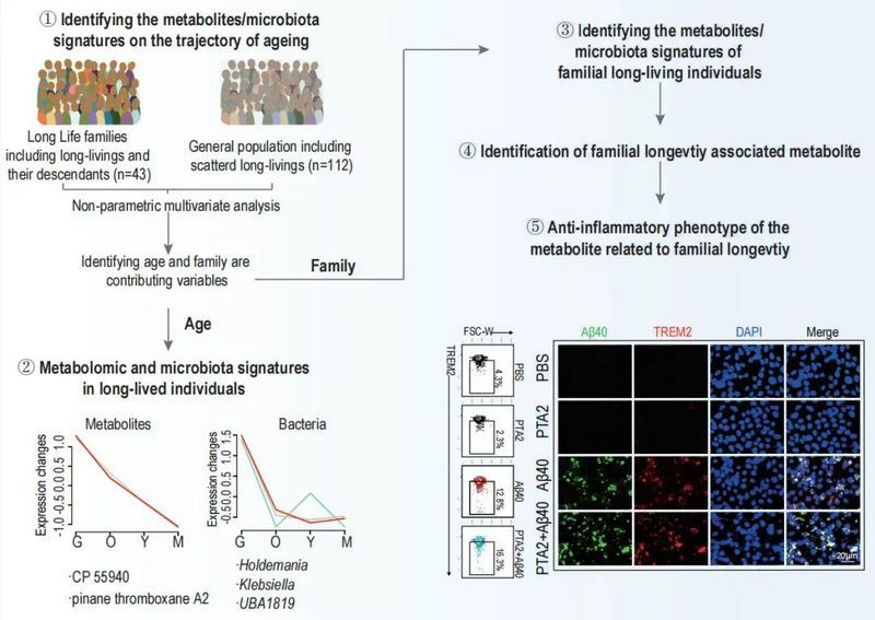 研究发现长寿家族队列的长寿个体拥有不同于普通人群长寿个体的微生物组和代谢组特征,并进一步发现与衰老呈正或负相关的系列代谢物,其中正相关代谢物蒎烷血栓素 A2 (PTA2) 的水平在长寿家族个体及其年轻后代中始终高于普通人群,并与年龄正相关;互作网络分析结果表明这些与衰老正相关的代谢产物与肠道瘤胃菌科(Ruminococcaceae), Intestinimonas, Alistipes, 乳球菌(Lactococcus)等的相对丰度紧密相关。进一步的功能分析显示 PTA2 通过激活STAT6信号途径上调小胶质细胞中TREM2的表达,增强了小胶质细胞吞噬具有神经毒性作用的β-淀粉样蛋白40(Aβ40)的效率并提高了抗炎表型,表明 PTA2 对宿主健康具有保护作用。为进一步证实在生理浓度下PTA2的这一作用,合作团队用基于液相色谱串联质谱法(LC-MS/MS)定量测定了健康人群和与老龄相关的脑小血管病人(ASVD)血清样本中PTA2的浓度,发现病人的PTA2浓度显著低于健康人群。综上,本研究证实肠道微生物组及其代谢产物在健康老化中的作用,提示PTA2可以作为健康老化潜在的干预靶点之一。