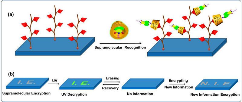 中大新闻网讯(通讯员付俊)先进加密技术对于信息安全、通信、商业、健康等至关重要。基于磷光/荧光效应的加密材料和技术具有便携、易操作等优点,得到了广泛的研究。常用的策略将生色团均匀地分布在基底材料中,依靠离子、氧化还原、光等局部“触发”或“淬灭”荧光效应,实现加密或解密,甚至可逆擦除-写入,但存在非特异性解密或信息丢失等问题。将超分子作用与荧光技术结合可实现信息加密,其可逆性有利于实现重复加密-解密。研究高度选择性和特异性加密/解密方法,实现信息可逆的写入、擦除、重编程,提高加密水平,具有重要的意义。