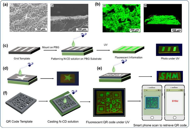 图2(a,b)SEM和CLSM图;(c-e)条纹、星星及字母荧光加密材料的制备;(d)二维码的制作、信息记录、保护及信息解读
