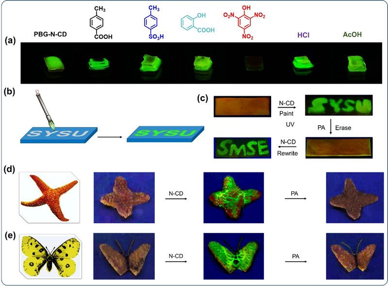 图3(a)在BG-N-CD中加入不同酸的荧光照片及信息的荧光淬灭、擦除和重写