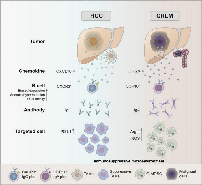 研究人员对61例原发性肝癌(HCC)和62例结直肠癌肝转移(CRLM)样本进行分析,证实了B细胞在HCC和CRLM微环境中发挥着的关键调节作用。通过单细胞测序对24250个B细胞进行深入剖析,研究发现IgG+浆细胞在HCC中显著积累,而IgA+浆细胞则更倾向于在CRLM中富集。