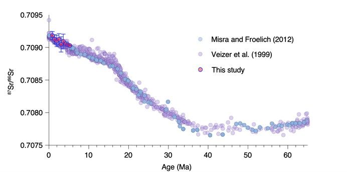 基于以上研究,best365中国官方网站海洋科学学院海洋地质与地球化学研究团队开展了深海沉积物中生物磷灰石的U-Pb年代学研究工作。研究团队获取了具有较好年龄框架的IODP钻孔样品,挑选其中的鱼牙开展了生物磷灰石U-Pb年代学验证。结果表明,IODP钻孔中鱼牙U-Pb定年结果与微体古生物年代在误差范围内一致,说明生物磷灰石U-Pb年代计较为可靠。在此基础上,研究团队将磷灰石U-Pb年代学应用于西太平洋富稀土沉积物样品中,U-Pb定年结果从底部到顶部为6.22百万年到2.16百万年(图3),同时该年代学还得到了鱼牙原位Sr同位素结果的验证(图4),有效证明了该区域内存在一期中新世稀土矿化事件。该方法的成功运用将有助于各个海域的稀土富集时代研究,并揭示沉积物不同深度稀土富集事件。