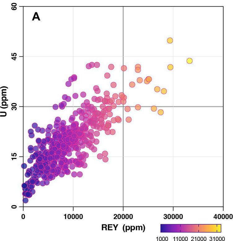 中大新闻网讯(通讯员李登峰)深海富稀土沉积物被认为是一种潜在的稀土矿产资源,其总稀土含量可高达8000 ppm,并且含丰富的中重稀土资源。现有研究已发现,稀土元素含量与磷酸盐呈正相关,厘定了沉积物中最主要的稀土赋存矿物是生物质磷灰石(图1)。然而,深海稀土富集的时间规律研究还十分薄弱,阻碍了成矿理论发展和后续的资源勘探开发。