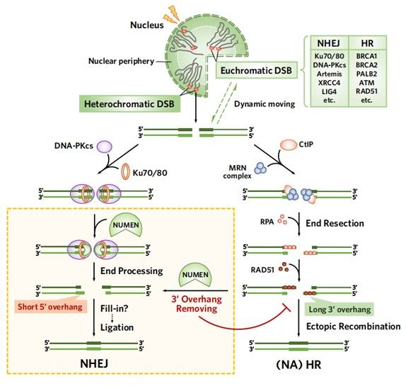 2023年6月15日,best365中国官方网站生命科学学院的松阳洲课题组与孙逸仙纪念医院合作在Nature Cell Biology杂志长文发表了题为“Transmembrane nuclease NUMEN/ENDOD1 regulates DNA repair pathway choice at the nuclear periphery”的研究成果。该研究利用CRISPR筛选,首次报道了核膜锚定的核酸酶NUMEN/ENDOD1参与NHEJ修复通路,并通过特异性切割3’垂悬DNA(3’overhang DNA)调控NHEJ/HR通路的选择。NUMEN的核膜定位为核周分布的LADs进行NHEJ修复创造了条件,有利于基因组稳定性的维持。另外,NUMEN的缺失也会导致BRCA1突变的肿瘤细胞对PARPi产生耐药。NUMEN的发现解释了细胞如何根据不同染色质状态以及核内空间分布选择最有利的DSB修复方式,以最大程度维持基因组的稳定性。