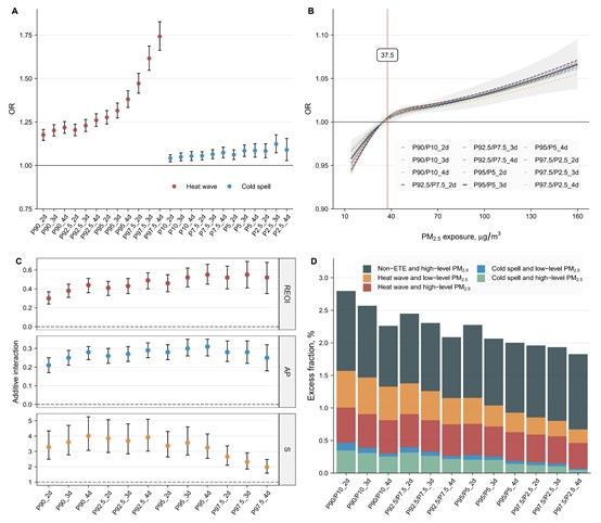 中大新闻网讯(通讯员刘跃伟)气候变化背景下,以热浪和寒潮为代表的极端温度事件不断加剧,呈现出频次高、强度大、持续时间长等特点,已成为全球关注的环境和公共卫生问题。前期证据表明,极端温度事件与心肌梗死(常见的不良心血管事件)的发生有关,但目前尚不清楚其是否同时增加因心肌梗死死亡的风险。同时,大气细颗粒物(PM2.5)危害心血管健康,被认为是诱发心肌梗死等不良心血管事件的重要危险因素。鉴于全球气候变化背景下极端温度事件和PM2.5污染复合暴露场景日趋频繁,进一步了解热浪、寒潮与PM2.5对心肌梗死的协同影响具有重要的公共卫生学意义。