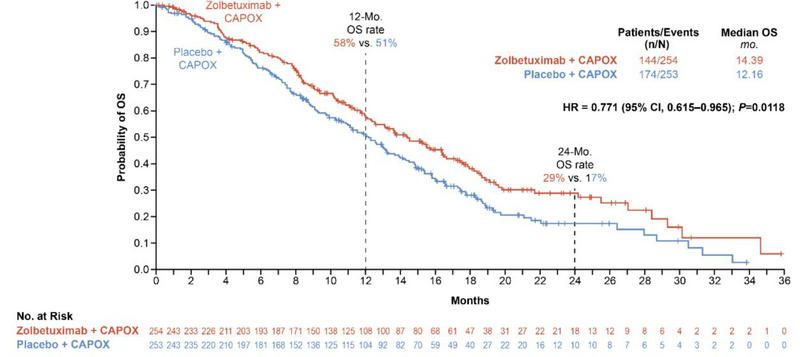 在关键次要终点方面,Zolbetuximab与CAPOX联合用药显著延长了OS,治疗组和安慰剂组的中位总生存期分别为14.39个月(95%CI:12.29-16.49)和12.16个月(95%CI:10.28-13.67),死亡风险降低了22.9%(HR=0.771;P=0.0118)。此外,在CAPOX基础上加入Zolbetuximab进行治疗,未增加严重不良反应发生率(治疗组和安慰剂组分别为47.2%、49.8%)