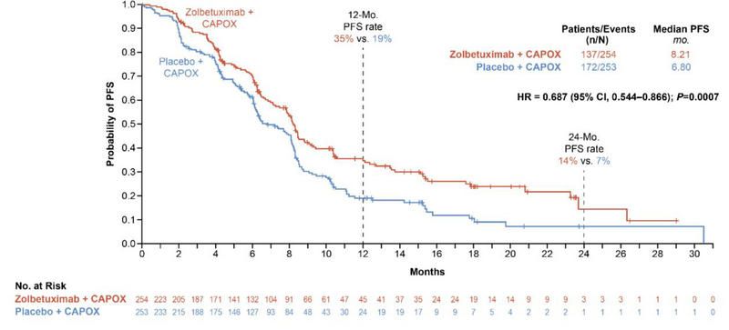 GLOW研究结果显示,与安慰剂+CAPOX组相比,Zolbetuximab+CAPOX组的PFS显著提升,治疗组和安慰剂组的中位PFS分别为8.21个月(95%CI:7.46–8.84)和6.80个月(95%CI:6.14–8.08),疾病进展或死亡风险降低了31.3%(HR=0.687;P=0.0007),达到了主要终点。