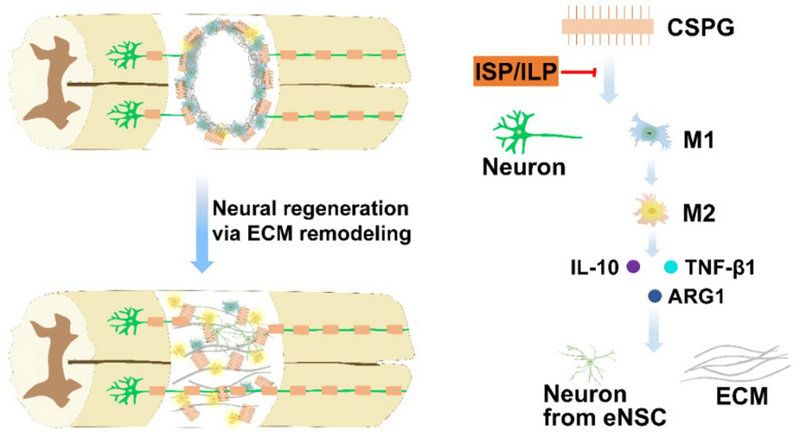 图1: F-SAP缓释ISP/ILP调控脊髓损伤后微环境促进神经再生示意图