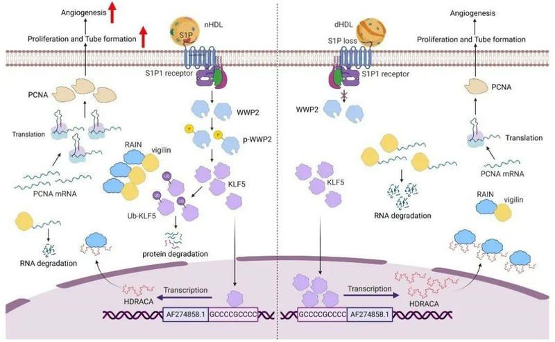 团队首先通过对lncRNA测序结果分析筛选,发现HDRACA可调节血管内皮细胞的增殖和管状形成,并确定了HDRACA是定位于内皮细胞浆中的长度553nt的无蛋白编码能力的lncRNA。进一步实验证实,nHDL可降低血管内皮细胞中的HDRACA表达,而dHDL对HDRACA表达的降低作用明显减弱。通过一系列分子实验发现,nHDL携带的S1P可与血管内皮细胞的S1P1相互作用诱导WWP2泛素连接酶磷酸化激活,催化HDRACA的转录因子KLF5泛素化降解,抑制HDRACA的转录。而dHDL携带的S1P含量明显减少,导致dHDL对HDRACA表达的抑制作用明显减弱。进一步实验证实nHDL抑制血管内皮细胞的HDRACA表达可促进血管新生,而dHDL对HDRACA表达的抑制明显减弱,导致它无法有效地促进血管新生。团队还发现HDRACA可以结合重要的血管新生调节蛋白RAIN,抑制RAIN和Vigilin的相互作用,进一步促进Vigilin诱导PCNA的mRNA不稳定降解,从而抑制PCNA的表达。nHDL通过抑制HDRACA表达影响RAIN-Vigilin-PCNA相互作用,促进PCNA的表达而促进血管新生。而dHDL无法有效地抑制HDRACA的表达,导致PCNA的表达减少,无法促进血管新生。