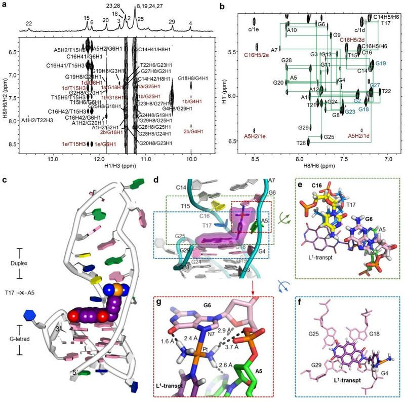 近日,best365中国官方网站化学学院毛宗万教授团队设计了一类由有机配体和铂单元组成的新型有机-铂杂化体(L1-cispt和L1-transpt),通过空间匹配引导与G4结合,同时通过铂单元与G4的共价结合将其锁定在结合位点(图1)。L1-transpt-MYT1L G4复合物的溶液结构表明,当L1-transpt与G4的动态空间结合达到平衡时,L1-transpt破坏了A5-T17碱基对,实现了MYT1L G4中G6残基的N7与铂单元的共价结合,而L1-transpt配体中的有机大平面通过π-π堆积作用结合在G-四分体平面上,这与作者之前报道的弱相互作用引导的空间结合不同(图2)。这是第一个配体与G4共价结合的溶液结构,对G4共价结合配体的设计具有重要意义。