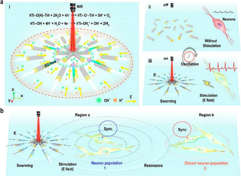 该团队提出了振荡纳米机器人的程序化集群,其推进和集群背后的场信息作为体外与生物神经元通信并触发神经振荡的介质。如图2a所示,设计了一个由近红外光驱动的高度可控的振荡纳米机器人群。纳米机器人通过纯水的光催化分解驱动电泳(并自建立的化学-电场梯度)。通过程序化的近红外光照射,纳米机器人群呈现周期性化学-电场和集体动态可逆收缩-膨胀-收缩(振荡)行为。局部视网膜神经节细胞(RGC)可以通过来自集群的振荡电场有节奏地激活(图2a ii和iii)。神经元与编程的纳米机器人集群节奏同步。有趣的是,在通过耦合振荡使没有物理接触的神经元群中观察到同步周期性的波纹活动,类似于自然神经系统中的振荡网络(图2b)。共振允许原本无法到达毫米级外的神经元信号得以传输,这不同于神经元通常认为需要突触直接连接和同步的方式。与数量有限的孤立神经元相比,神经元共振具有重要意义,因为大量同步神经元群诱导下游神经反应的机会更高。节律神经活动还允许在不同时间窗口(即节律周期的特定阶段)进行神经兴奋性调节,以便神经元组可以通过锁相神经振荡精确地相互作用。这代表我们的合成可编程振荡平台提供了与神经元系统通信的新方式。