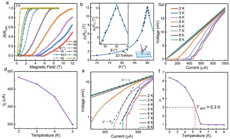 图2: Bi3O2S3的二维超导特性。(a) 不同磁场方向的电阻-磁场曲线;(b)二维Tinkham公式拟合的角度依赖上临界场曲线;(c)不同温度的电压-电流曲线;(d)临界电流-温度曲线;(e)双对数坐标下的电压-电流曲线;(f) BKT相变温度。