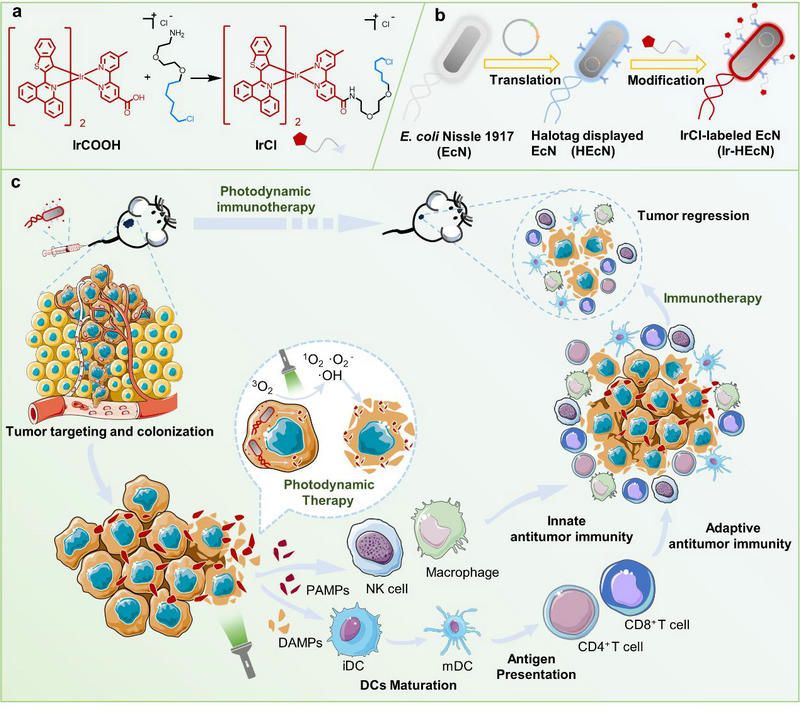 此项工作设计并构建了第一例铱光敏剂修饰的细菌杂合体。在525 nm绿光的激发下,该杂合体会导致肿瘤细胞发生焦亡并促进先天性免疫细胞(巨噬细胞、自然杀伤细胞)和适应性免疫细胞(树突状细胞、CD4+ T细胞和CD8+ T细胞)的浸润,最终实现肿瘤的光动力免疫治疗。此外,该肿瘤靶向策略也可能适用于其他抗肿瘤金属药物。