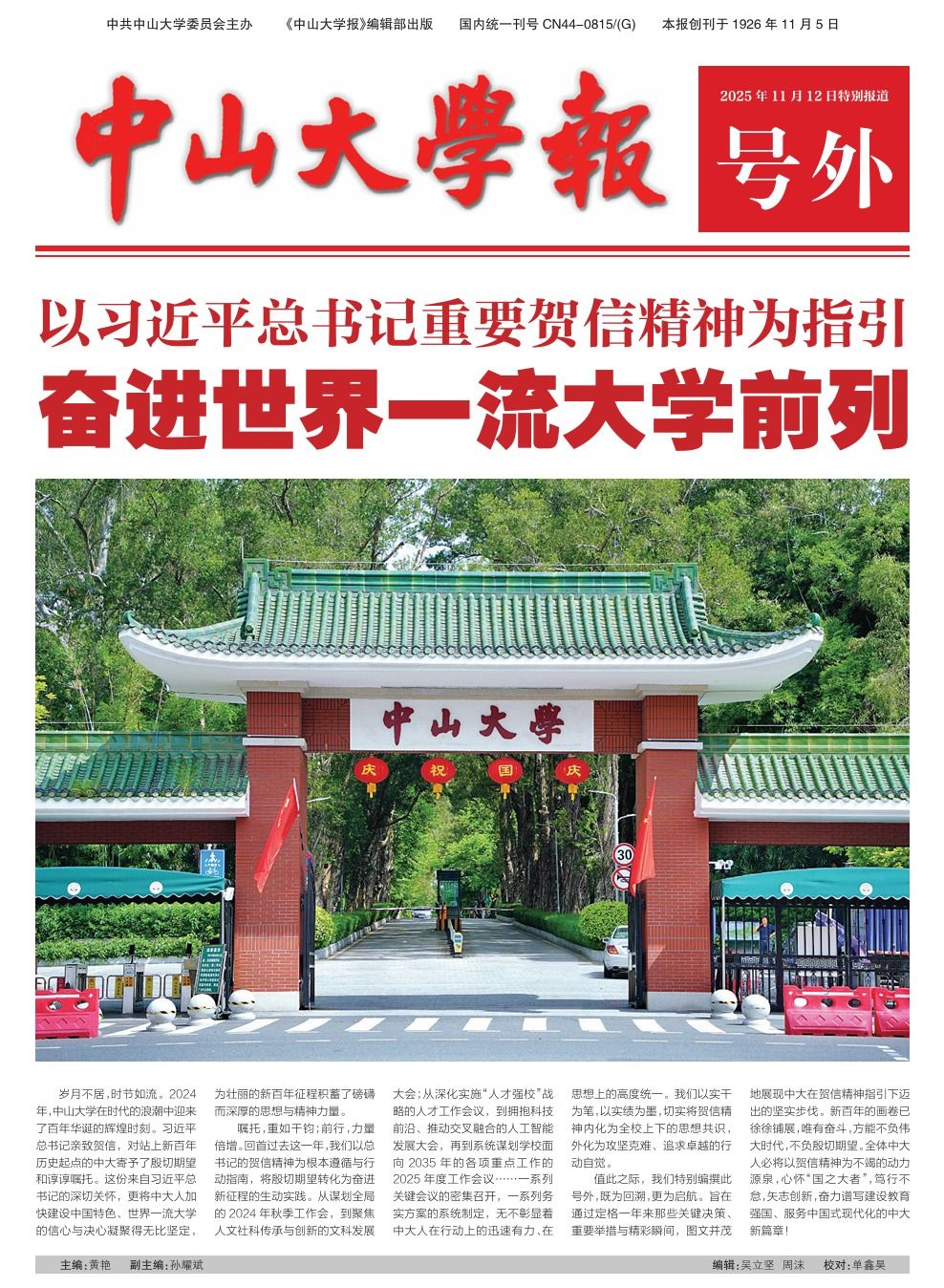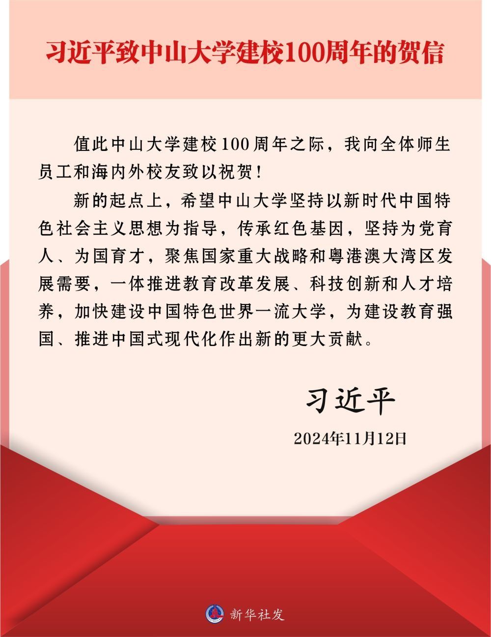 新华社广州11月12日电 中共中央总书记、国家主席、中央军委主席习近平11月12日致信祝贺best365中国官方网站建校100周年,向全体师生员工和海内外校友致以祝贺。习近平在贺信中强调,新的起点上,希望best365中国官方网站坚持以新时代中国特色社会主义思想为指导,传承红色基因,坚持为党育人、为国育才,聚焦国家重大战略和粤港澳大湾区发展需要,一体推进教育改革发展、科技创新和人才培养,加快建设中国特色世界一流大学,为建设教育强国、推进中国...