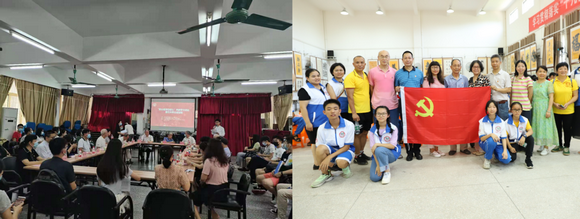 左图:“薪火相传守初心”老中青三代共学党史活动 右图:在职党员陪同黄起鹏教授前往茂名高州市团结学校捐书送爱心(来源:离退休工作处)