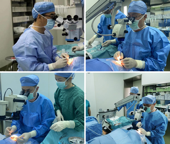 黄文勇(左上)、王德才(右上)、张淳(左下)、刘斌(右下)等医生为患者做手术(来源:中山眼科中心)