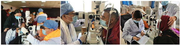 10月14日至16日,医疗队克服高原反应和语言障碍并兵分两路,一队进行眼部义诊,为眼科患者尤其是疑难杂症患者进行包括裂隙灯和视力检查以及问诊咨询服务;一队为筛查出的白内障患者完善胸片、心电图、血常规等检查后,实施白内障复明手术。16日,医疗队结束最后一天的筛查后,仍有10余位群众匆匆赶到眼科诊室,其中还有从四川远道而来的患者。虽然筛查工作早已结束,但专家们依然耐心地为他们进行了细致的眼部检查,并为筛查出来的白内障患者安排了白内障复明手术。