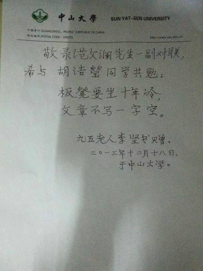 2013年,李坚老师题字“板凳要坐十年冷、文章不写一字空”勉励后学(来源:历史学系)