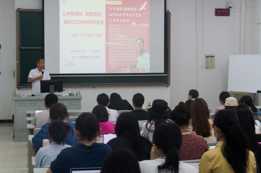 中大新闻网广州5月21日电(通讯员李劲峰、尹思雨)为了进一步做好党史学习教育,近日,中国语言文学系党委组织开展“心有榜样 激励担当——视听记忆中的百年党史”系列研习活动,第一期研习活动在南校园中文堂举行,邀请了林岗教授围绕电影《开天辟地》和中国共产党的诞生作专题讲座。各师生党支部、学生团支部参加讲座。活动由系党委书记于海燕主持。