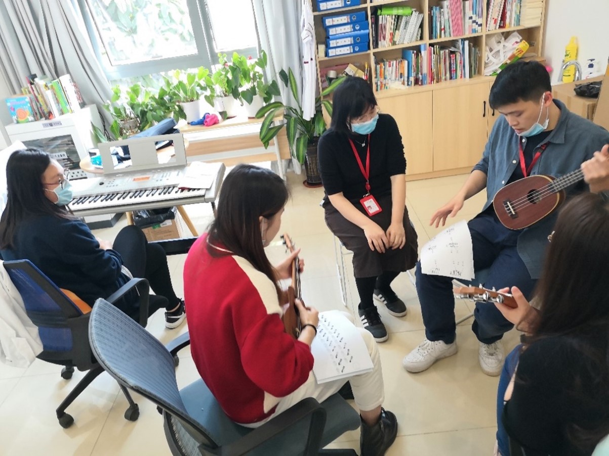 医院组织志愿者练习用尤克里里弹奏《小星星》,为音乐体验活动做准备(来源:附属第七医院)