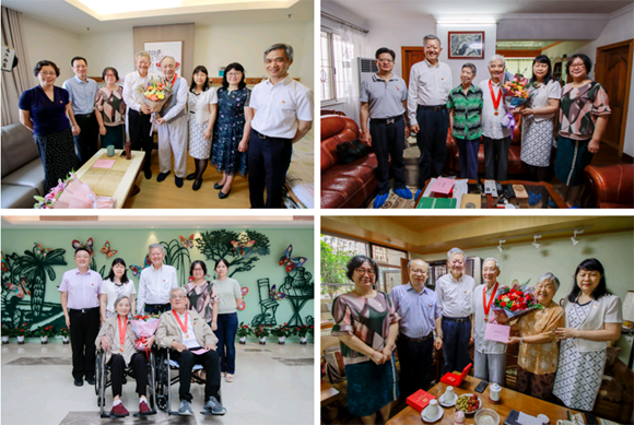 陈春声、马骏向各位老领导介绍了学校的发展近况,与他们促膝交谈,忆往事、话家常,亲切询问他们的身体状况和精神状态,叮嘱他们保重身体,向他们转达了学校党委的殷切关怀,并将纪念章、感谢信和鲜花送上,感谢他们以赤诚的爱党爱国之心,为学校各项事业发展作出的重要贡献。