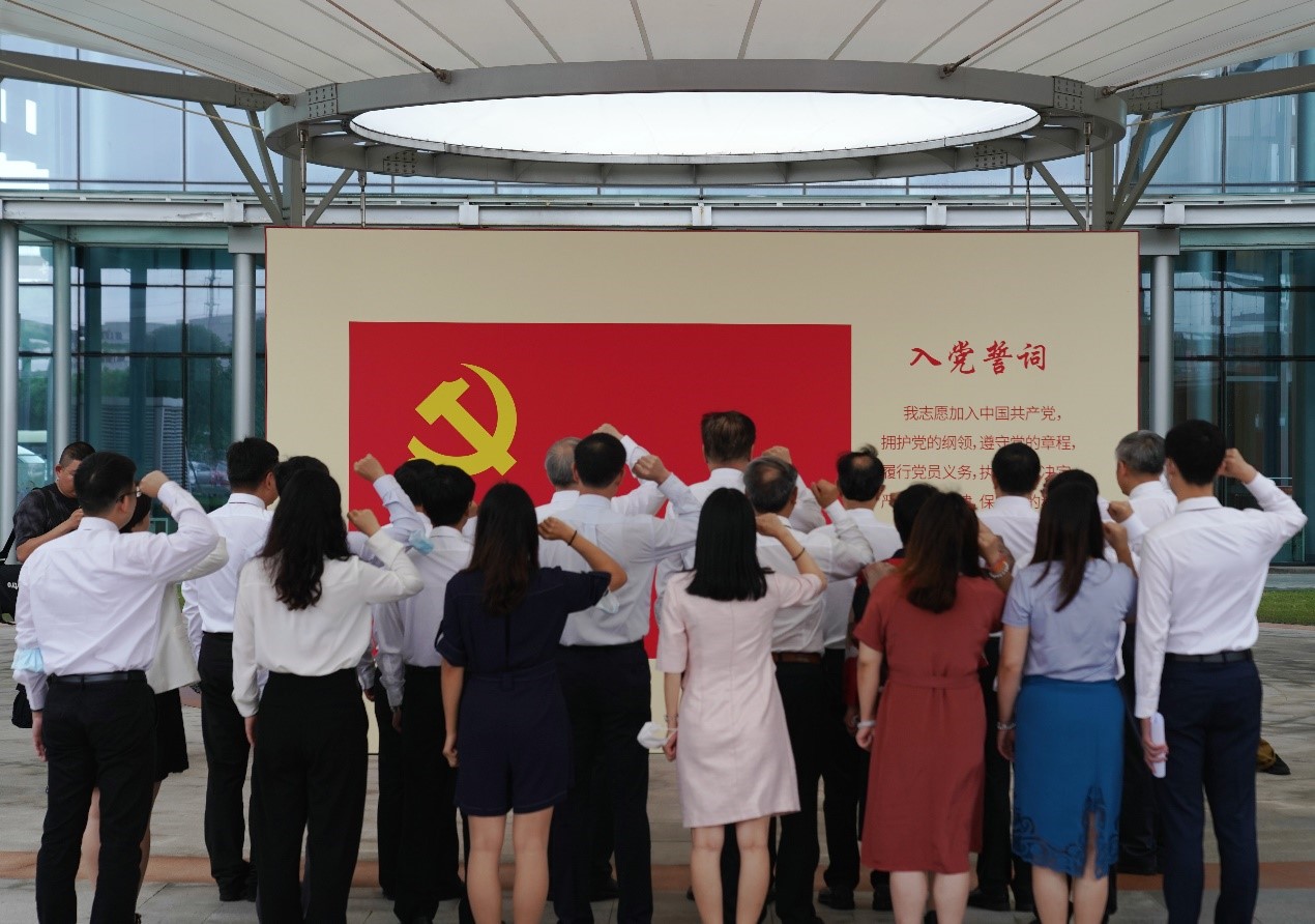 “我志愿加入中国共产党,拥护党的纲领,……”在中国船舶江南造船百年历史展前面,陈春声领誓,罗俊、兰平等19名党员同志掷地有声地再次向着鲜红的党旗宣誓。