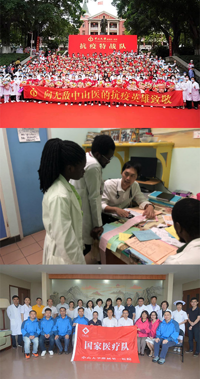 2020年新冠肺炎疫情发生后,医院先后派出185人次奔赴抗疫前线,支援武汉、北京、东莞、香港、绥芬河等多个地区,并远赴塞尔维亚多线抗疫,展现了“无敌中山医”的责任担当。通过巡回医疗、“组团式”帮扶、柔性扶持等,对西藏、新疆等基层地区进行“输血+造血”式帮扶,为脱贫攻坚提供有力保障。据不完全统计,五年来共派出专家500多人次,共诊治门患者51000多人次,教学查房8800多次,示范或带教手术近2000例,开展业务培训23000多人次。为服务国家“一带一路”倡议,医院积极响应国家号召,医院先后组建援助斐济国家医疗队、援助多米尼克医疗队。在斐济,医疗队三个月内诊治了上千名患者,举办了10多场学术讲座,谱写了新时期中斐、中多友谊佳话。
