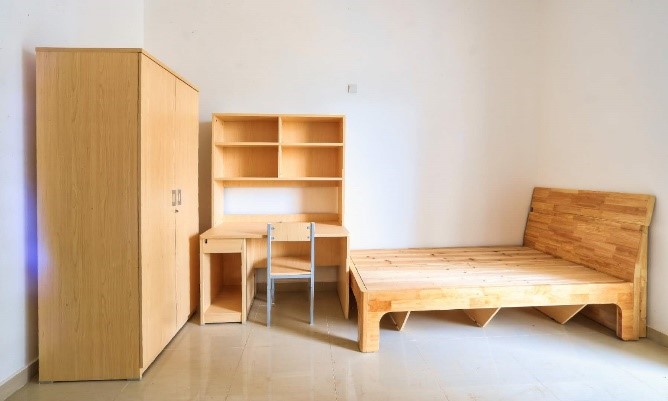 硕士生和博士生宿舍家具采用实木床铺与优于E0级的实木复合板作为家具主材,配备独立书桌、衣柜等,设计人性化,色调温馨,为潜心治学创造了舒适的宿舍环境。