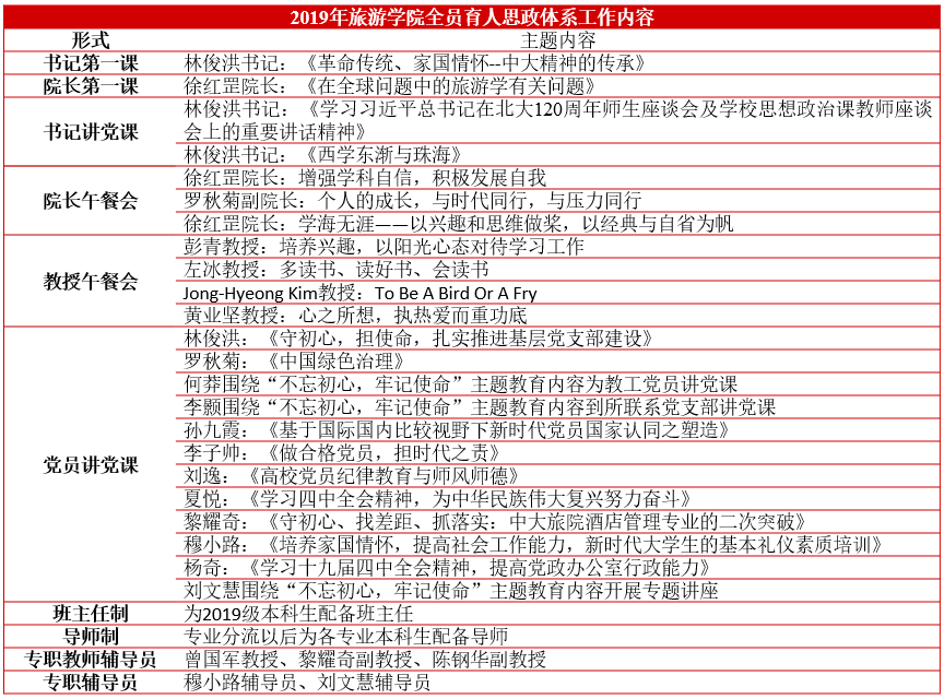 2019年旅游学院“全员育人”思政体系工作内容(来源:旅游学院)