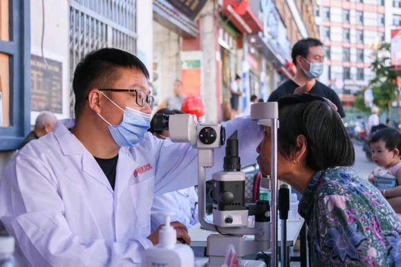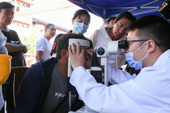 宫海军医生为当地群众检查眼睛(来源:党委宣传部)