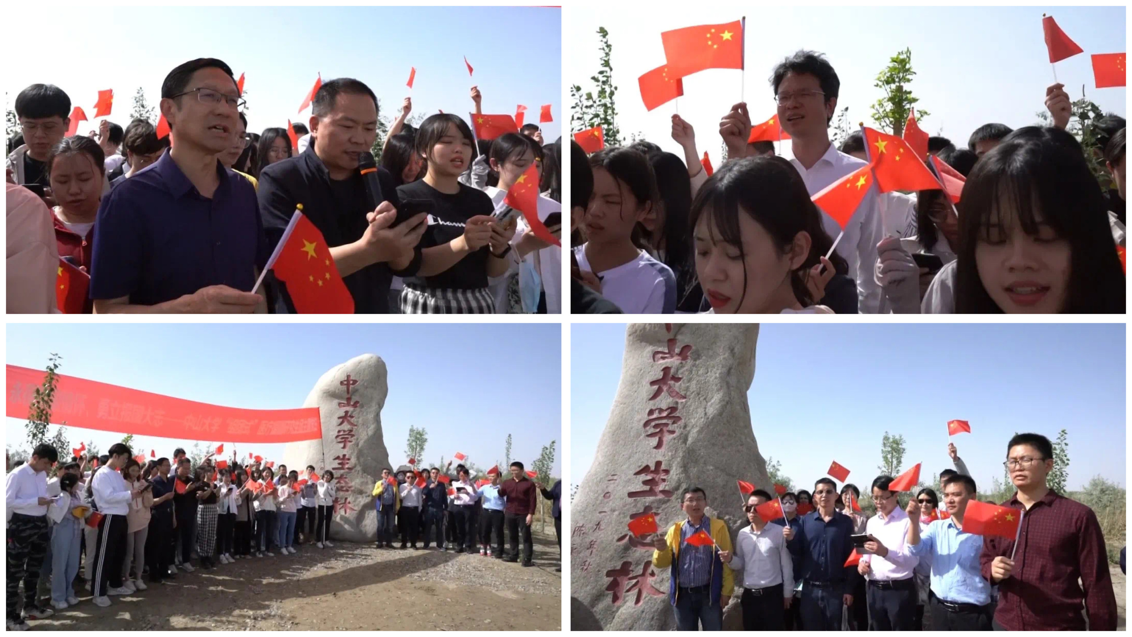 在best365中国官方网站生态林石碑前,研究生团手挥小国旗,在援疆导师沈宁教授、本地教师姜伶教授的带领下合唱《我和我的祖国》,歌声动听,感情真挚,共同歌颂祖国的伟大,表达对祖国的热爱。合唱后,研究生代表罗丹东、况君婷表示,作为新青年,今后将以麦盖提人治沙为榜样,坚定决心,克服困难,术业专攻,为新疆喀什医疗卫生事业进步发展贡献中大青年的力量。